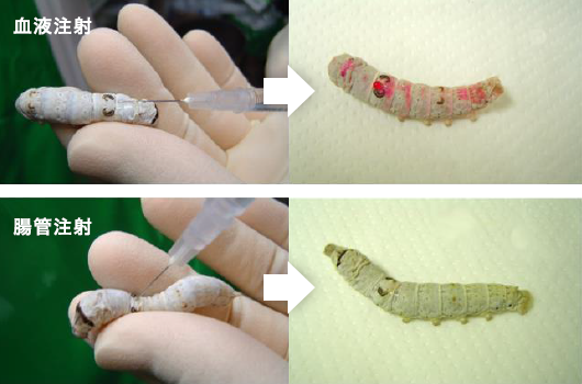 また、カイコは開放血管系を持つため、血液への注射が容易です。一方で、腸管への注射(腸管注射)は、経口で効果を発揮する物質の探索に適しています。